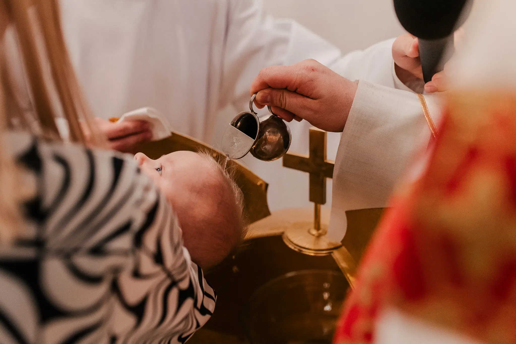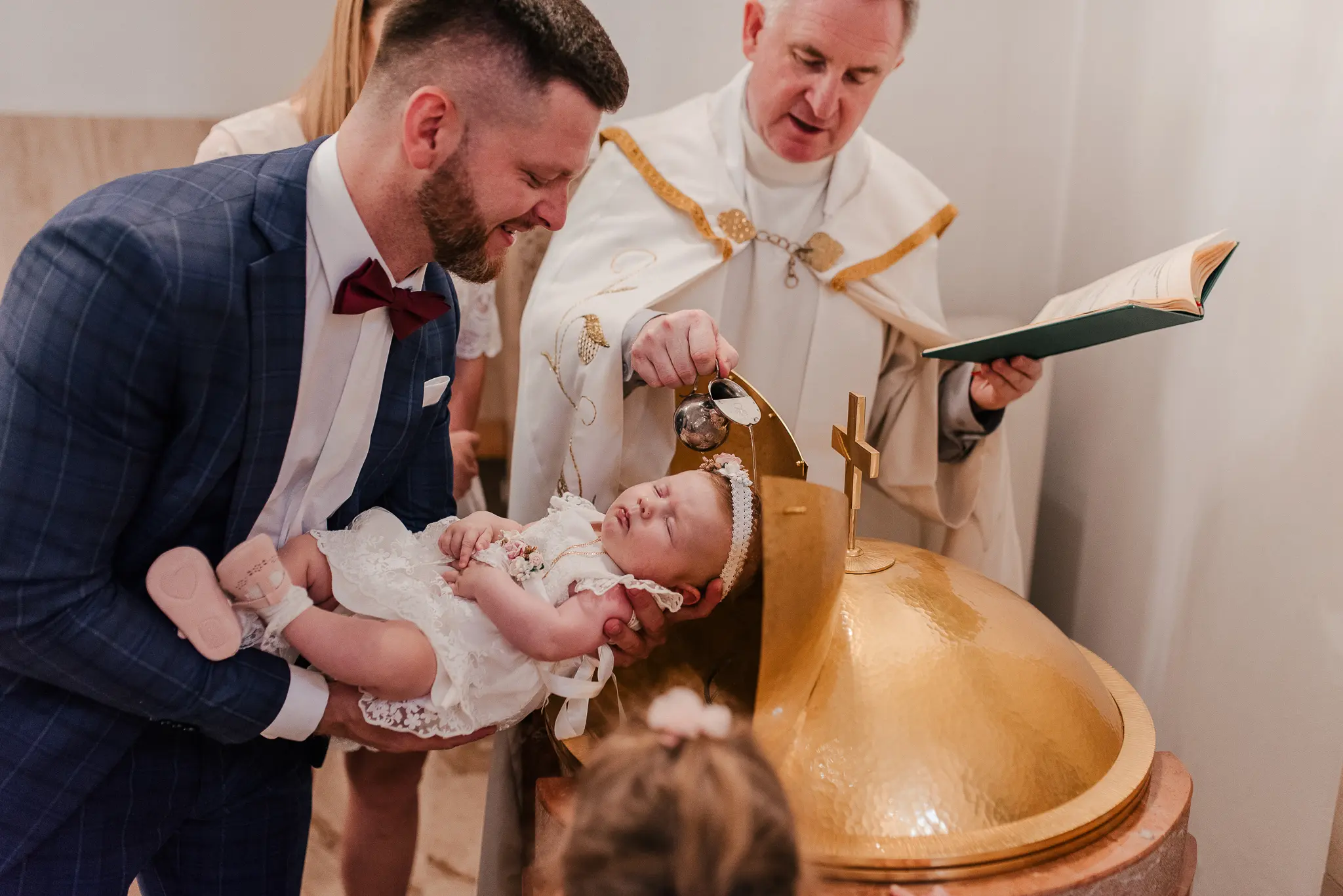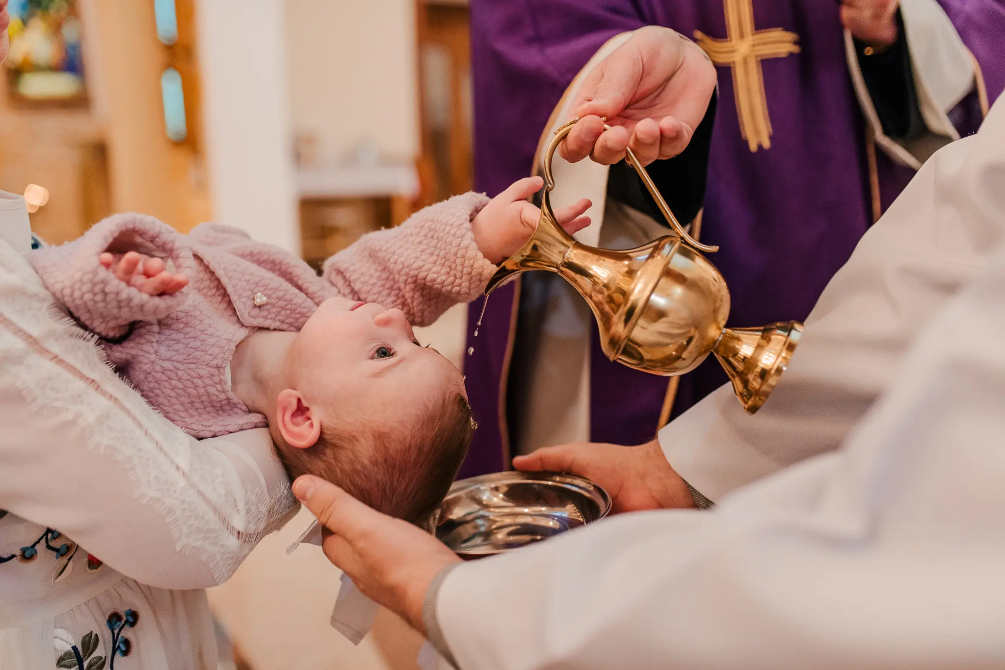 Chrzest święty to pierwszy sakrament dziecka, ale też często okazja, aby przedstawić nowego członka rodziny szerszemu gronu. W związku z tym, na tę uroczystość warto zaprosić także fotografa. Podczas reportaży staram się być dyskretnym towarzyszem całego wydarzenia – wykonuję wiele zdjęć niepozowanych, łapię Wasze uśmiechy, śmieszne minki dziecka, czy serdeczne uściski babci i wnucząt. Przy okazji chrztu możecie wybrać czy chcecie abym towarzyszyła Wam tylko podczas uroczystości w kościele, czy również podczas przygotowań w domu i świętowania na przyjęciu. Ja zawsze namawiam Was do reportażu z przygotowań domowych, ponieważ wtedy wykonuję wiele zdjęć maluszka i pozostałych członków rodziny, a także mam szansę na wykonanie zdjęć szatki, świecy czy innych dodatków. Posiadam kurs liturgiczny, który daje mi uprawnienia do fotografowania w kościele podczas uroczystości.